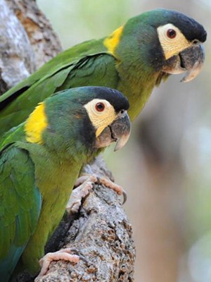 The Golden-Collared Macaw is a small mostly green Central South American parrot. They are in the mini-macaw family.
